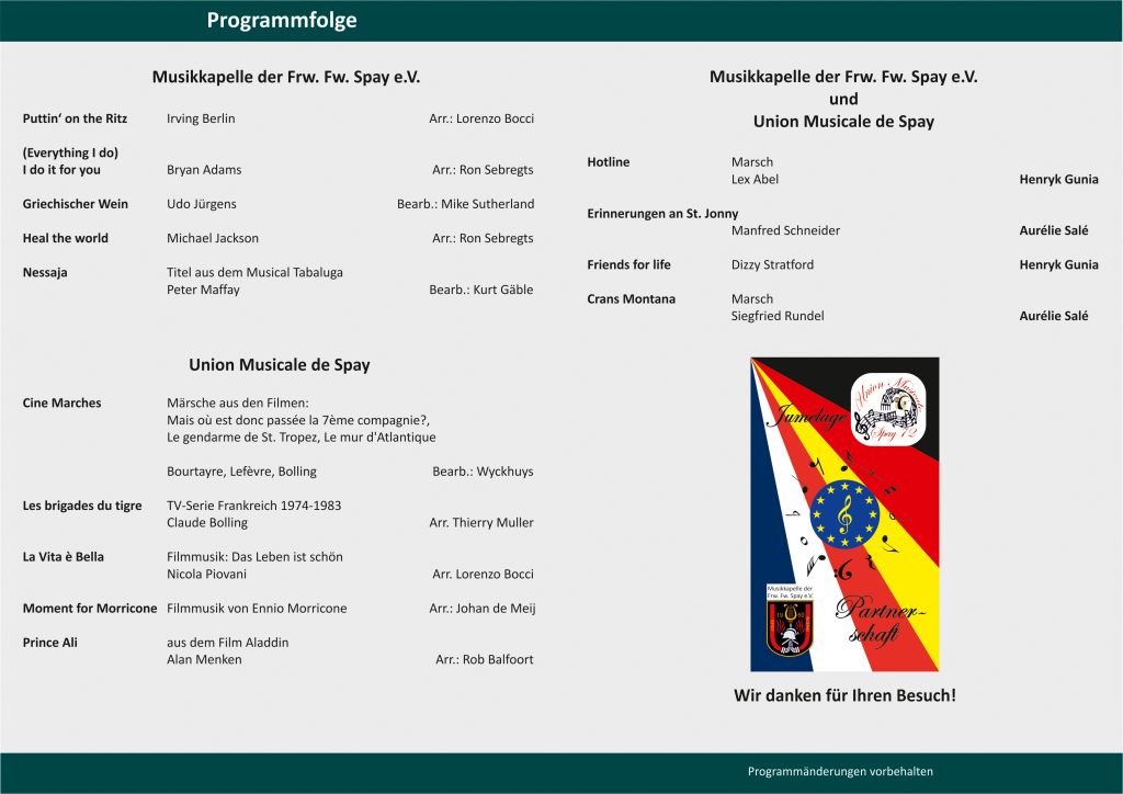An Pfingsten erhalten die Musikerinnen und Musiker der Musikkapelle der Freiwilligen Feuerwehr Spay e.V. Besuch von dem französischen Partnerverein „Union Musicale de Spay / Sarthe“. Neben der gleichen Ortsbezeichnung ist die Blasmusik das große Verbindungsglied der beiden Vereine. Dementsprechend wird am Pfingstwochenende ein umfassendes musikalisches Programm angeboten.