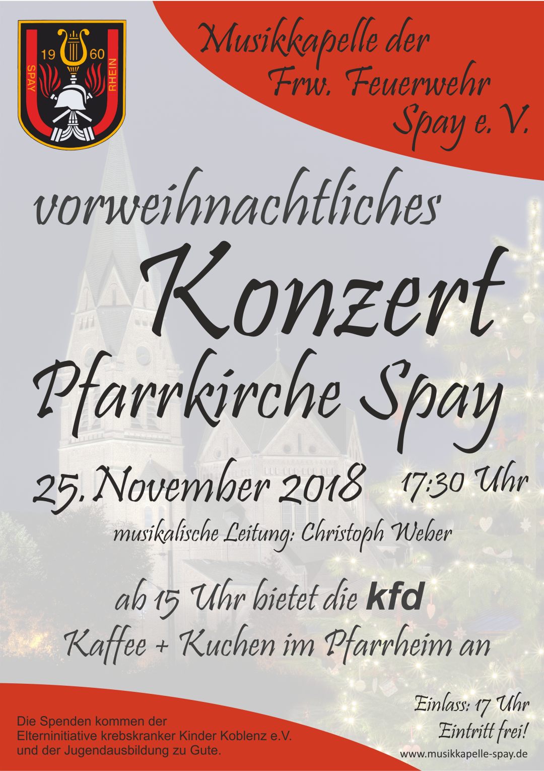 Am Sonntag, dem 25. November 2018 laden wir Sie ein, unser vorweihnachtliches Konzert in der Pfarrkirche St. Lambertus Spay zu besuchen. Der Beginn um 17:30 Uhr ist so gelegt, dass Sie vorher ab 15 Uhr das Angebot der kfd im Pfarrheim wahrnehmen können. Nach einem gemütlichen Nachmittag bei Kaffee und Kuchen genießen Sie anschließend passend zur anstehenden Adventszeit besinnliche, klassische sowie stimmungsvolle Musik in der Pfarrkirche.